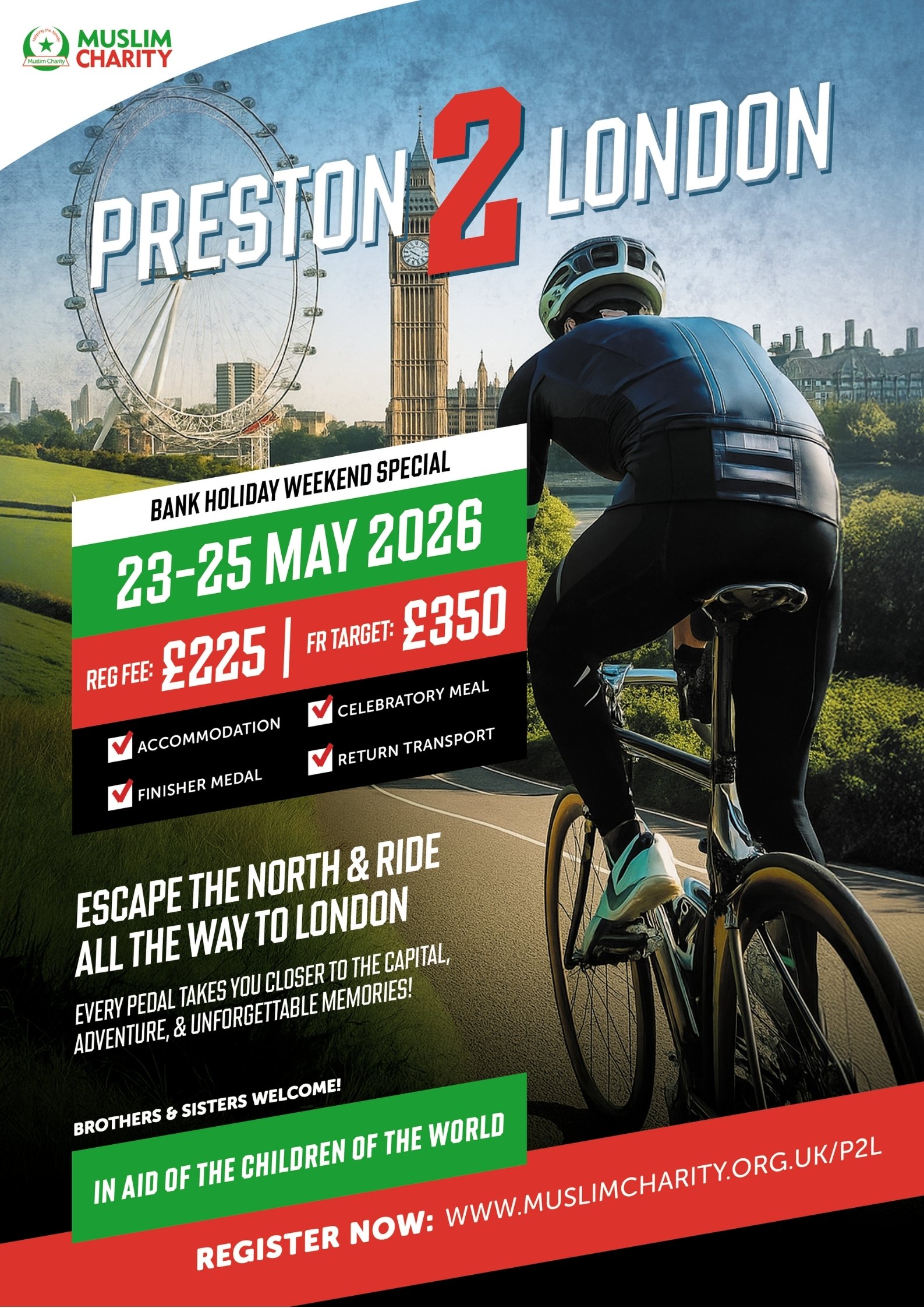 Join us for an unforgettable 3-day cycling journey from the historic streets of Preston to the vibrant heart of London with Muslim Charity. Open to both brothers and sisters, this endurance challenge is your chance to push your limits, connect with fellow riders, and be part of something truly meaningful.